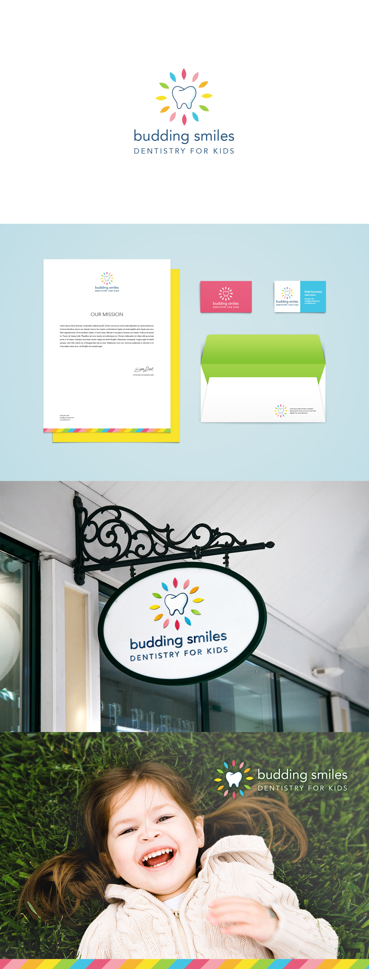 This is a logo and identity I created for a pediatric dentist's office. The flower petals play on the word "budding" and represent growth. I used bright and playful colors to appeal to kids.