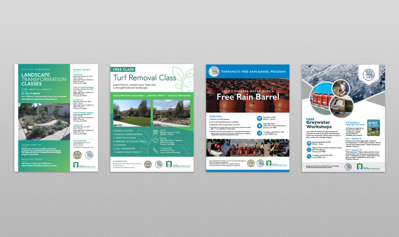 These are a few flyer designs I created for the City of Torrance Water Division. They promote the great resources Torrance offers its residents for water conservation.