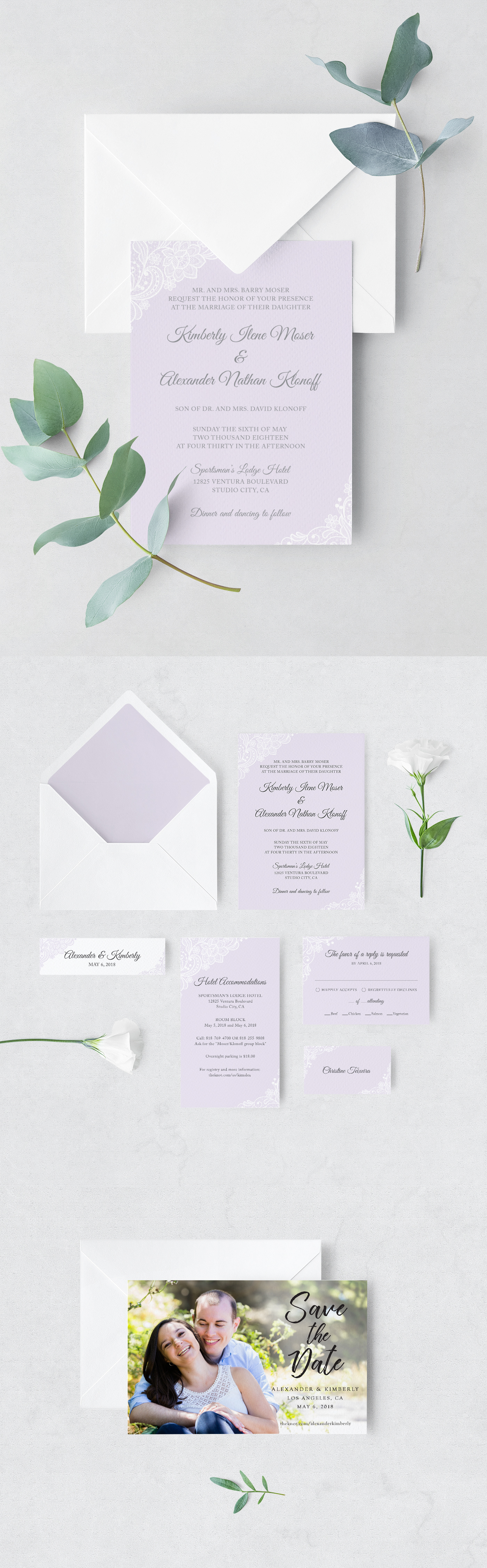 I worked with the couple to create this elegant lavender wedding invitation suite. This project includes a Save the Date, an invitation, RSVP card, accommodations card, and a belly band to tie it all together.